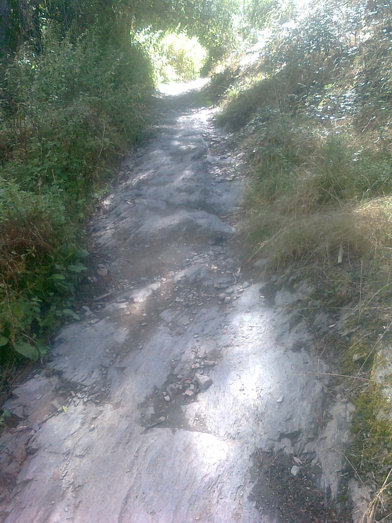 Este special amenajat, uneori paralel cu soselele, alteori pe camp, prin paduri, semnalizat peste tot cu SAGEATA GALBENA ,ori SCOICA. pe jos pe munte semne facute pe stanci, prin paduri  pe copaci, iar pe potecile din varful muntilor era semnul crucii facut din pietre asezate frumos una langa alta. Se intampla uneori sa traversezi sosele dar esti avizat din timp de panouri mari cu instructiuni. Dar te simti in siguranta, cu exceptia neprevazutului! Am patit-o cand un taur a sarit peste portile de la un tarc unde era inchis cu vacile si noi treceam pe acolo ne-am oprit speriat de moarte – ce facem daca vine spre noi?? – ne ascunsesem dupa niste tufe dar s-a dus la umbra unui pom de pe malul unui rau ce trecea un pic mai in lateralul drumului,. De fapt el nu mai putea de cald 🙂