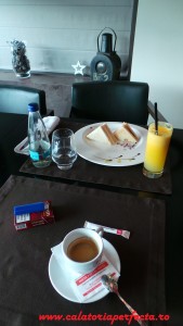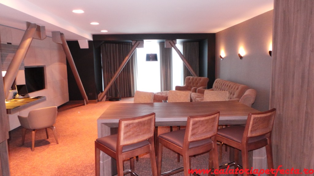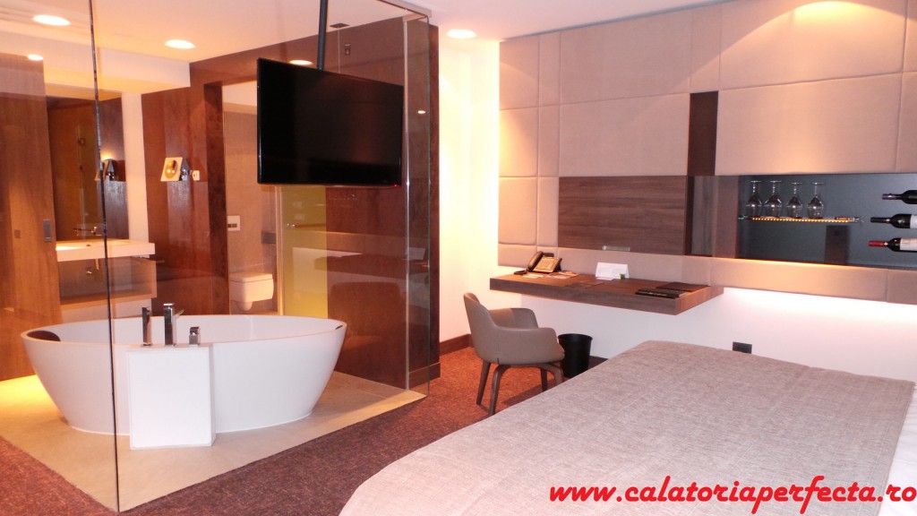 Eşti întâmpinat cu un mesaj de bun venit pe televizorul din camera si sincer în afară de faptul că era un pic întunecată camera, am rămas impresionat de cum arată! Am aflat ulterior că îţi poţi seta singur intensitatea luminii de la panoul de lângă uşă dar tare complicat mi s-a părut, multe butoane, multe posibilităţi…pentru un nehotărât nu e bine să-i dai atâtea de ales. Spaţioasă – 34 m² , cu un design superb, cu un pat imens, moderna, cu baia vizibilă,  inclusă oarecum în cameră ( are un panou care se poate trage şi astfel devine perete ), WiFi gratuit pe televizorul din camera, panoul cu toate mufele care-ţi trec prin cap pentru orice device deţii, colecţia de vinuri din care poţi să alegi, salteaua  de la SERTA şi toper-ul din păr de cămilă – antialergenic. Podeaua din baie încălzită ( durează vreo 45 de minute să devină placută la tălpi) , tastatura portabilă pentru smart tv-ul cu internet, halatele şi papucii de baie, minibarul, mocheta în care ţi se afundă piciorul ( e un motiv pentru care e linişte ), oglinda de  la baie care îţi arată toate defectele (ştiţi oglinda aia rotundă pe perete – există aici şi pentru că e de foarte bună calitate o să observi la faţa ta lucruri pe care habar nu aveai ca le deţii! ), grija pentru amănunte şi detalii, toate aceste lucruri fac din locul unde eşti unul cald şi primitor. M-am tot uitat pe fereastră şi fiind in Brasov este inevitabil ca, oriunde ai fi cazat, pe orice parte a hotelului ai avea fereastra sa nu vezi munţii! Priveliştea este minunată dacă faci abstracţie de blocurile gri din apropiere…